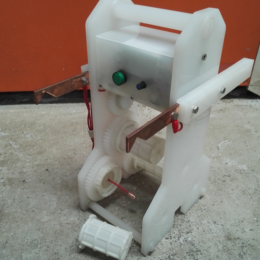 ①一般为一体式即下面为转动滚筒,上面为传动部分和导电钩子;此种制作一般承载重量不是很重的情况下(介于②和③之间的重量)