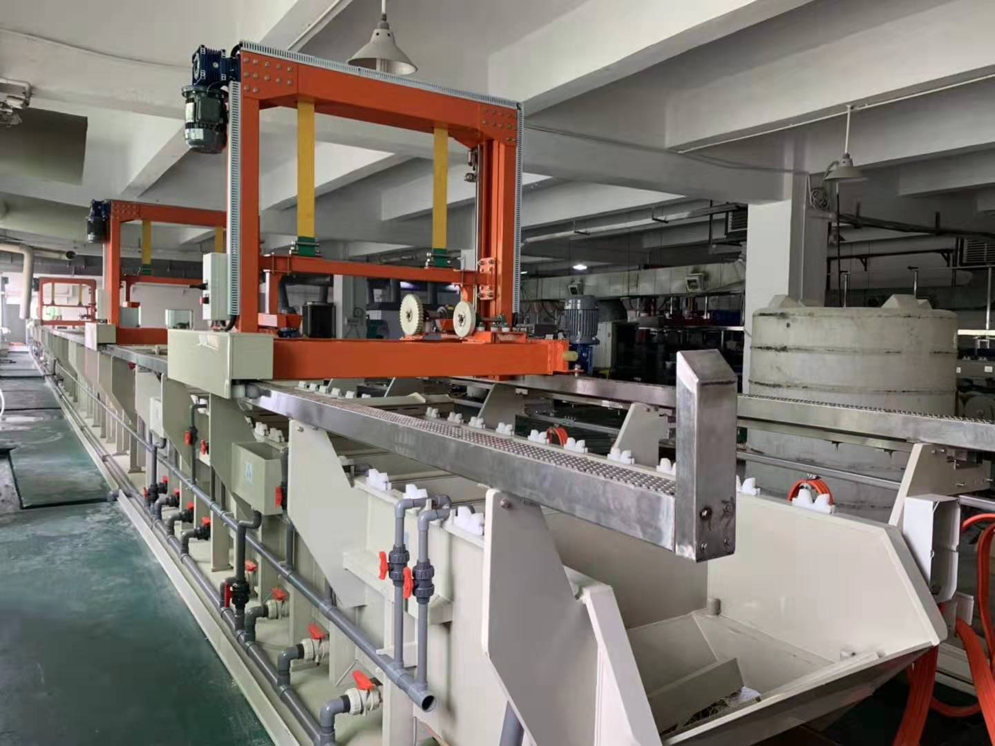 电镀处理过程中所用的设备主要有各类固定槽、滚镀槽、挂具、吊篮等。镀后处理是对零件进行抛光、出光、钝化、着色、干燥、封闭、去氢等工作,龙门式挂镀生产线,根据需要选用其中一种或数种工序使零件符合质量要求。镀后处理常用设备主要有磨、抛光机,各类固定槽。
