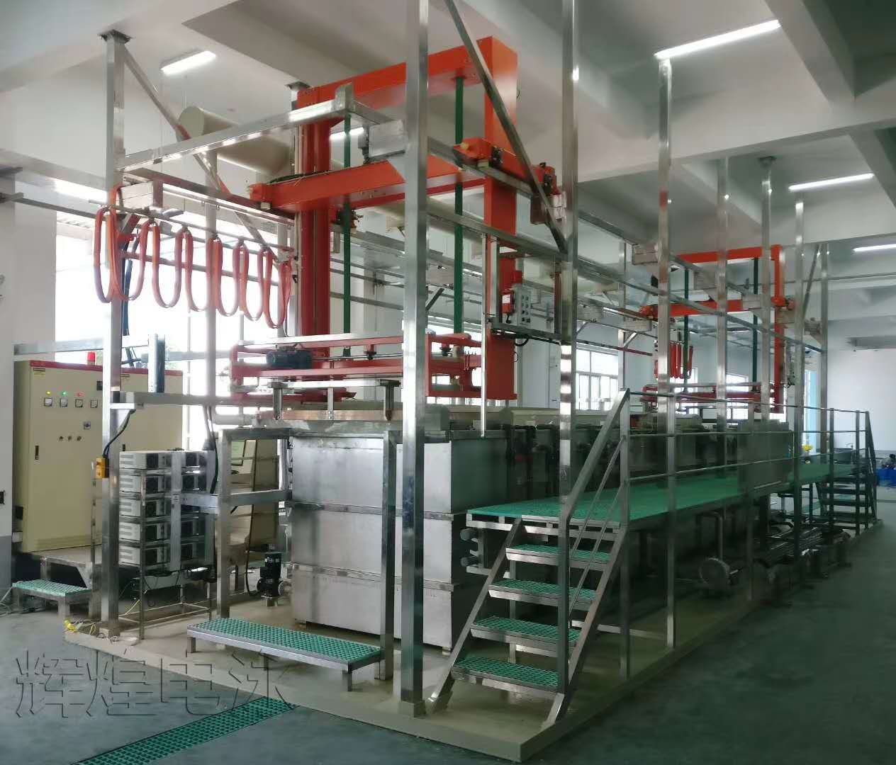 电镀处理过程中所用的设备主要有各类固定槽、滚镀槽、挂具、吊篮等。镀后处理是对零件进行抛光、出光、钝化、着色、干燥、封闭、去氢等工作,龙门式挂镀生产线,根据需要选用其中一种或数种工序使零件符合质量要求。镀后处理常用设备主要有磨、抛光机,各类固定槽。